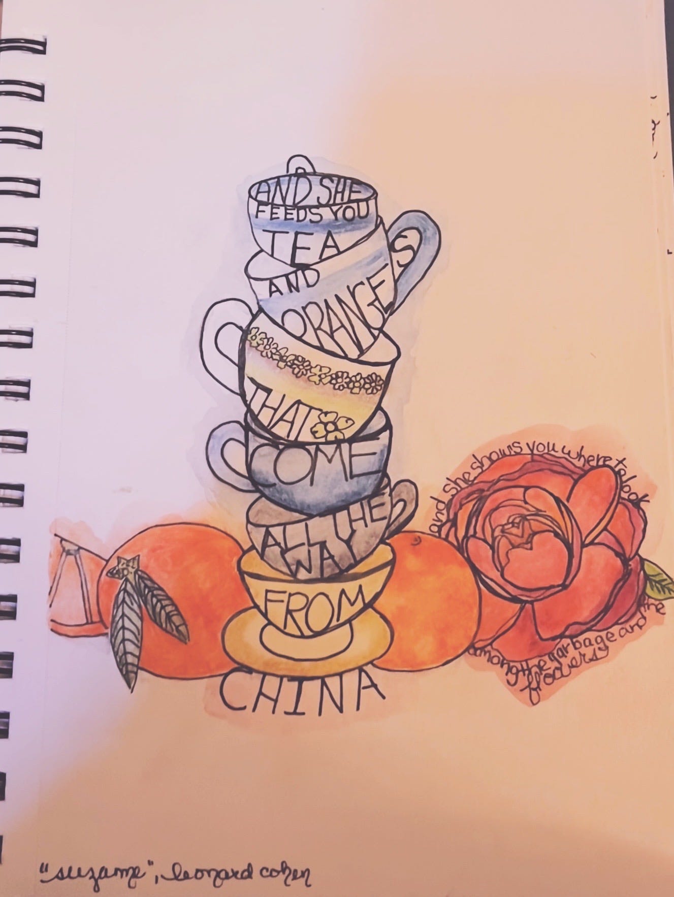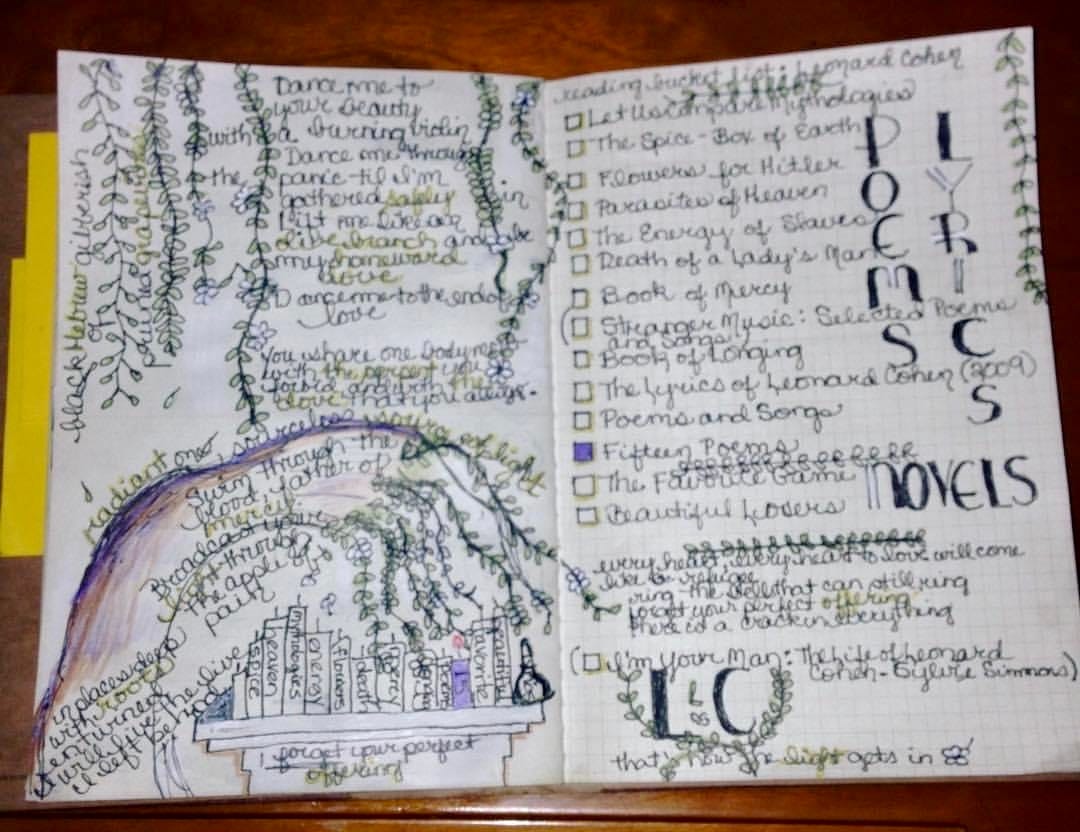 Reading bucket list: Leonard Cohen bucket list, poems & novels. Illustrations inspired by the melding of Scripture and sexuality in his writing. When I have read them all, the altar candles could burn down the olive tree and grapevines. Freudian on my part?
