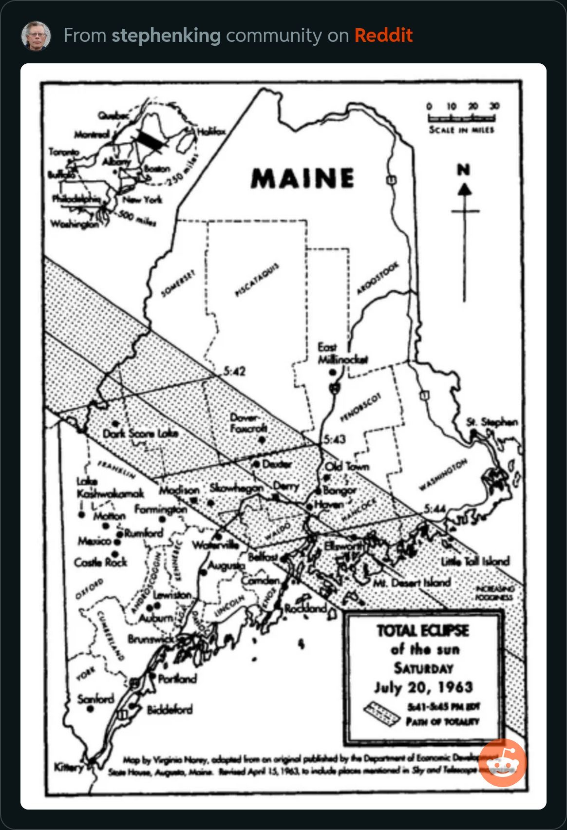 30 years ago this week, the totality of an eclipse cut across Maine, and changed Dolores Claiborne’s and Jessie Burlingame’s lives forever. But did you know there was supposed to be a third character? Stephen King planned this to be a trilogy (or more, possibly), called In the Path of the Eclipse. Notice it hit Derry. We missed out on some spooky stuff, considering what we received. Listen to hear all about it, and the mythology of the eclipse. Not for nyctophobics.