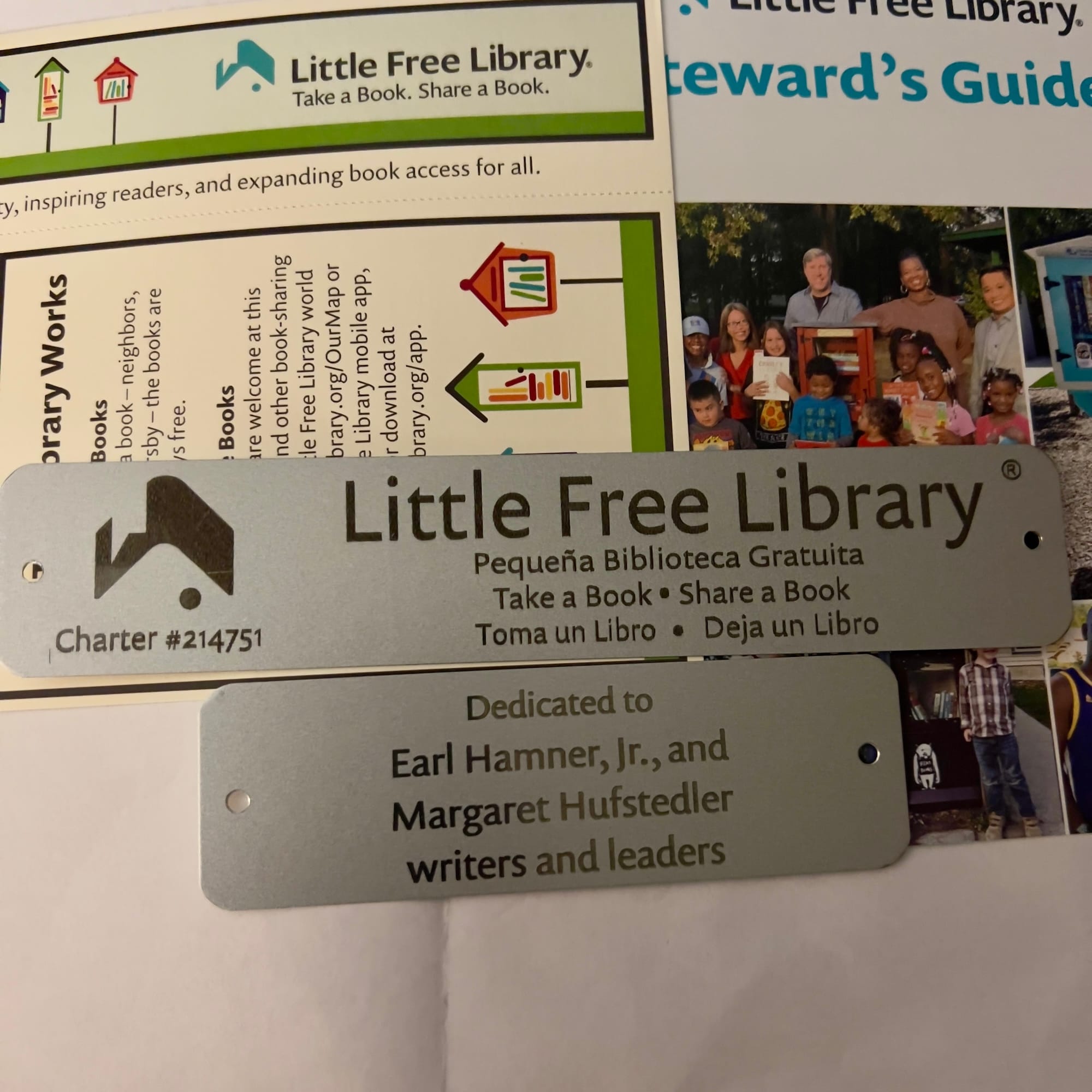 Isn't it pretty? The charter and dedication plaques for the Little Free Library have arrived! Eat Hamner, Jr. was the real John Boy Walton from right here in Nelson County; Margaret Hufstedler was my mother-in-law, and she wrote music and taught adults to read in Nelson County for decades.