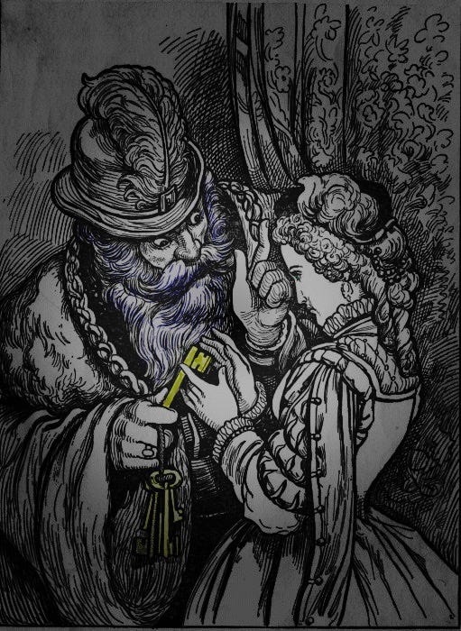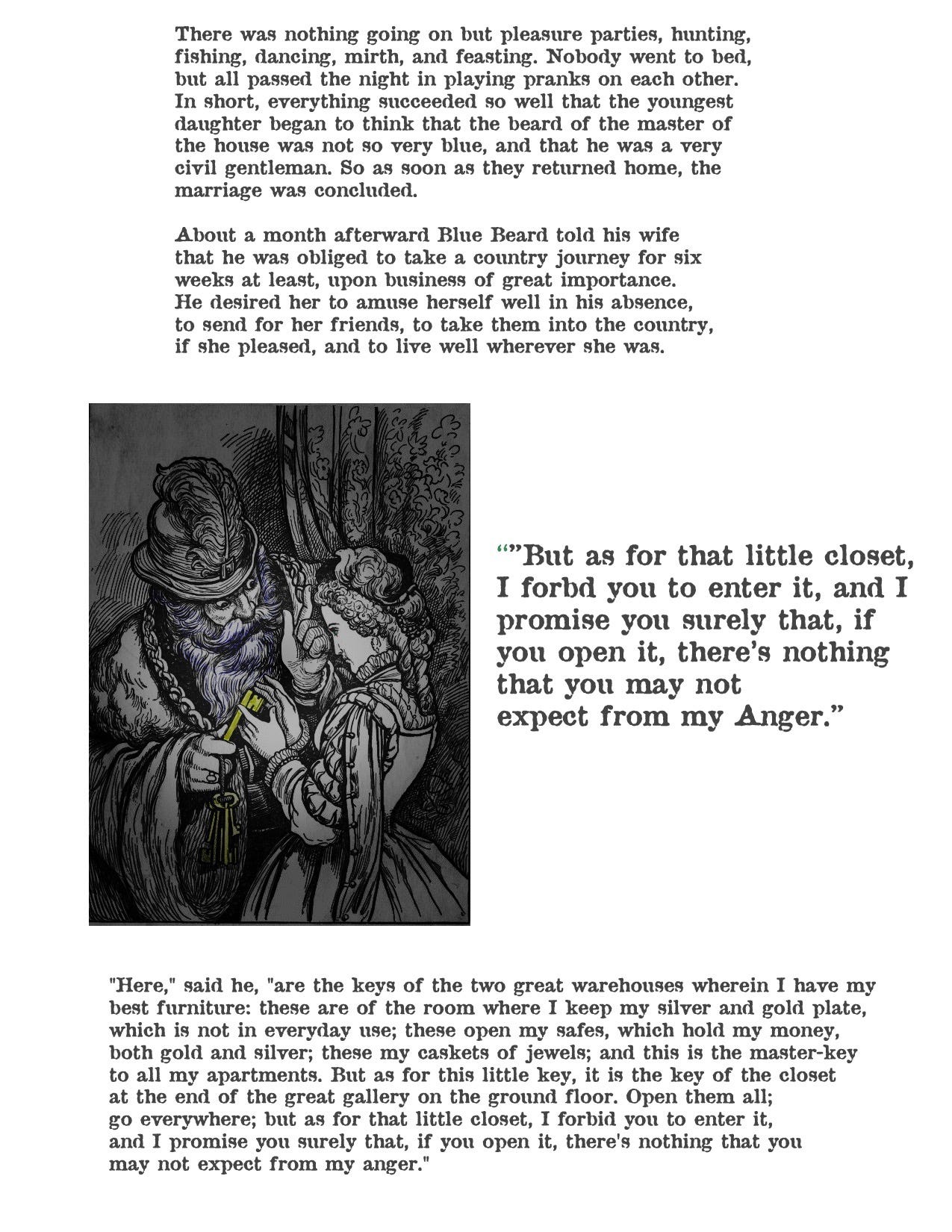 Move to adulthood, and I got into grabbing vintage illustrations from the original fairy tales, the horrific versions, and adding color and shading to them. Some of them I even typeset into new pages, like this image from the original Bluebeard from Charles Perrault, first published in 1697.