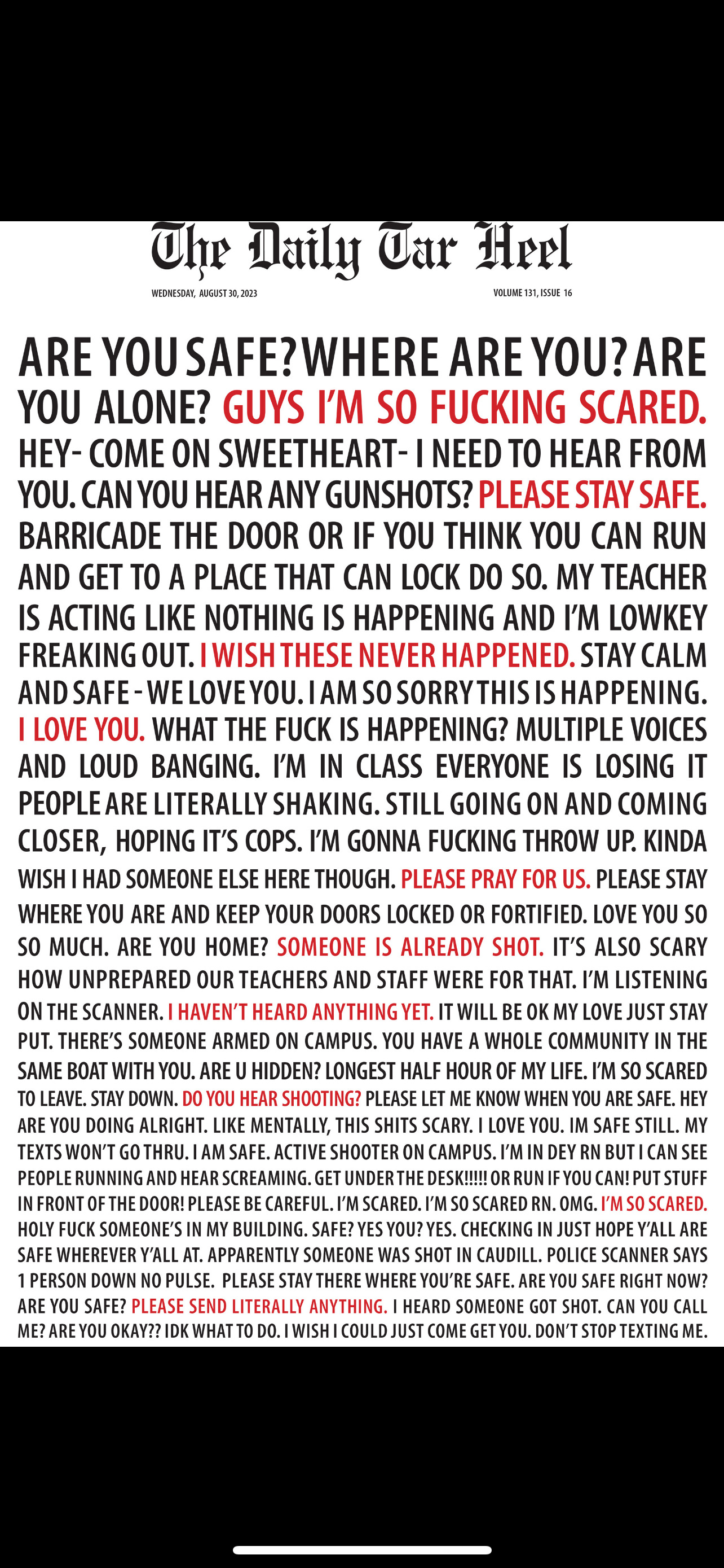 I attended NC State for undergrad. My friends attended Chapel Hill just down the road. My understanding is that a graduate student killed a faculty member. This was the school newspaper’s response: the editors asked for screenshots of students’ sent and received text messages during the lockdown.